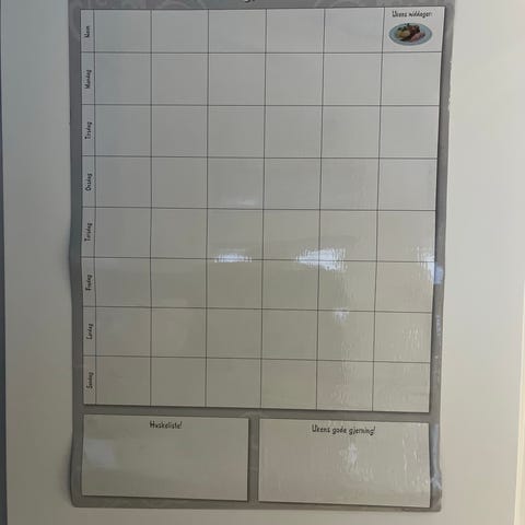Magnetisk ukesplanlegger tavle med rutenett for ukedager og ekstra felt nederst for notater eller andre kategorier. Egnet til planlegging av aktiviteter, avtaler eller oppgaver i hjemmet eller på kontoret.