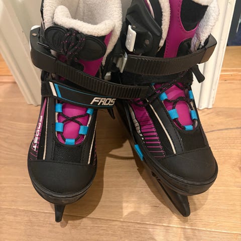 Firefly Multi Size skøyter for barn i størrelse 34. Skøytene har justerbar hardplast-yttersko med spenner og borrelås for stabil passform. Overdelen er i syntetisk materiale i svart og lilla med polstret innersko for økt komfort. Blad i metall egnet til generell skøytebruk på is. Passer til barn som trenger støttende skøyter til lek og enkel trening på isen.