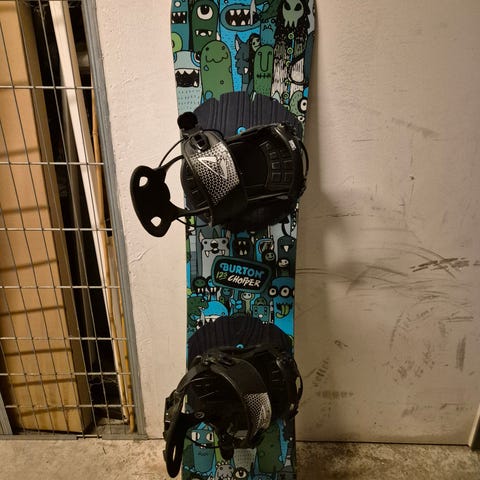 Burton Chopper snowboard på 120 cm med tilhørende bindinger. Brettet har en flerfarget grafikk med figurmønster. Bindingene er justerbare og montert på brettet. Egner seg som barne- eller juniorsnowboard avhengig av høyde og vekt på bruker. Passer til bruk i alpinbakke og på preparerte løyper. Bindinger montert passer fra str 35 og oppover, har også bindinger for mindre snowboardsko som kan følge med.