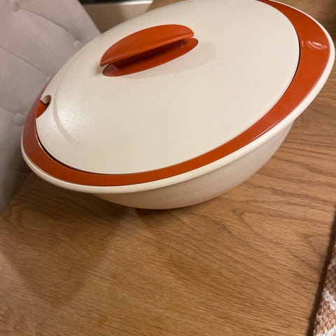 Tupperware serveringsbolle i plast med gult lokk. Bollen er hvit og har integrerte håndtak på sidene for enklere håndtering. Lokket er gult med rillet mønster. Egnet til servering eller oppbevaring av mat på kjøkkenet. Størrelsen fremgår av bildet med målebånd. Den har bruks spor . Den er brukt men ikke sprekker . Så holder til bruk i lang tid videre . Selges for 100 kr . Kan sendes med post nord for 70 kr eller fiks ferdig eller kan hentes etter avtale .