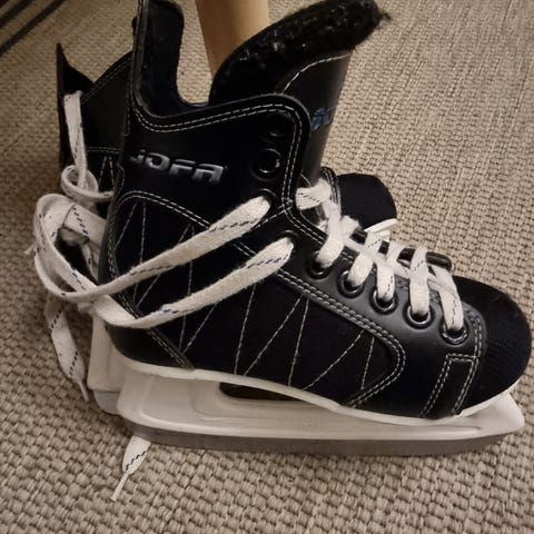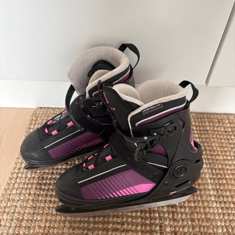 Justerbare skøyter i svart med røde og hvite detaljer. Modellen har plastskall med ankelstøtte, myk innersko og lukking med borrelås og spennelås for å holde foten på plass. Passer til bruk på isbaner og skøytebaner for fritid og lek. Egnet for barn eller ungdom, avhengig av størrelseinnstilling.