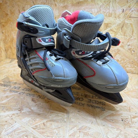 Justerbare barne skøyter til salgs . Modellen har plastskall med ankelstøtte og myk innersko. Den har lukking me borrelås og spennlås for å holde foten på plass.