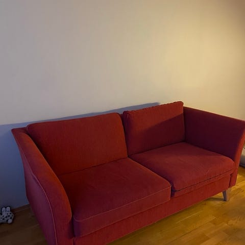 Sofagruppe fra Slettvoll til salgs. Sofaen har sjeselong, og to stoler følger med. Gruppen er i god stand, med litt slitasje på enden av armlenet på stolene.