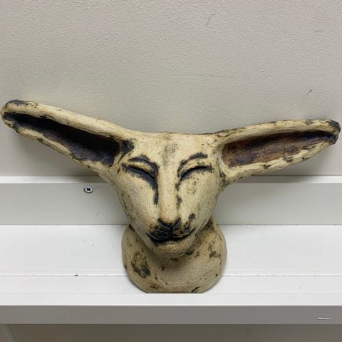 Keramikk skulptur som forestiller et stilisert katte-hode med store, utstående ører. Overflaten har en rustikk, strukturert finish i lyse og mørke naturtoner. Figuren står på en liten sokkel som er en integrert del av skulpturen. Passer som dekorasjonsobjekt i hylle, på bord eller i vinduskarm. Materiale: keramikk/brennt leire. Farge: natur/beige med mørkere sjatteringer.