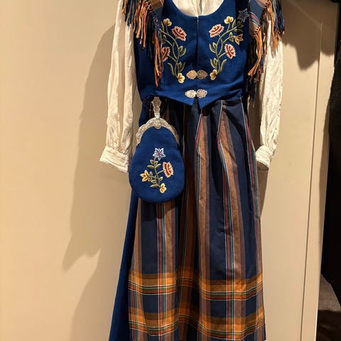 Vurderes solgt eller byttet.. Blå nordlandsbunad str L/xl. Brukt av dame på 173 cm. Det som følger med er : Vest/stakk, sjal og forkle. Ca mål: Skjørt: 103 cm lengde, vest ca 49 fra skulder til midje. ca 90 i omkrets i livet. ca 104 bryst under arm . Forkle ca 85 k lengde. Selges for 19.000. ( På bildet ser vest og bunad litt skjev ut, men det er bare slik den ligger). Den henger ikke på bildet.