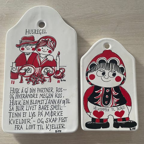Begge har hull for oppheng og er merket Norway på baksiden. Perfekt som dekor på kjøkken, hytte eller i et retro/vintage-interiør.