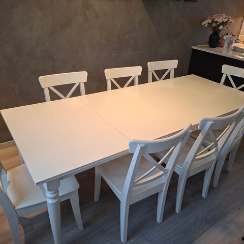 Pent brukt IKEA spisegruppe (bord med fire stoler) inkl innleggsplate!! Må hentes og bæres ut selv.