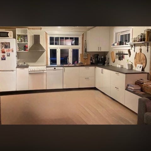 Kjøkkeninnredning i hjørneløsning med skap og skuffer i treverk. Over- og underskap gir god oppbevaringsplass, og benkeplaten går langs begge vegger. Kjøkkenet har plass til integrerte eller frittstående hvitevarer som komfyr, oppvaskmaskin og kjøleskap, avhengig av kjøpers behov. Innredningen passer til montering i tilsvarende hjørneløsning i bolig, hytte eller andre rom hvor det er behov for et funksjonelt kjøkken med god lagringsplass. Komfyr, vifte og oppvaskmaskin kan følge med (i tillegg i pris). Kom gjerne med bud