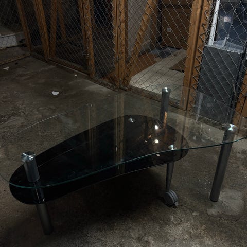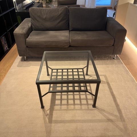 Solid og tungt bord i glass og stein . Glass er 65*65 cm Total lengde 131 cm