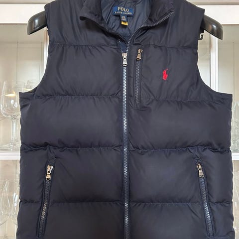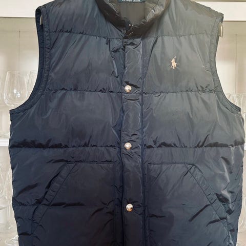 Ralph Lauren Polo dunvest for herre i størrelse XXL, men jeg har valgt å sette størrelse L da den er liten i størrelsen og sitter som er Large. Vesten er blå og har vattert dunfyll for isolasjon. Modellen har høy krage og glidelås i front med toveis glidelåssystem. Yttermaterialet er glatt og lett, med horisontale sømmer som holder dunfyllet på plass. Passer som ytterplagg på mildere dager eller som et ekstra lag under jakke i kaldere vær.