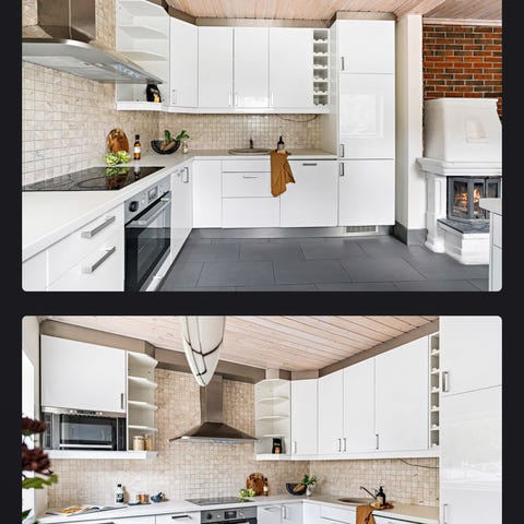 Kjøleskap og ventilatorhette følger med. Vask og blandebatteri også. Platetopp og oppvaskmaskin virker ikke som de skal, så disse blir kastet.
