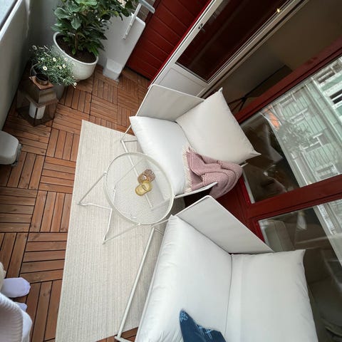Møblene er brukt én sesong og har stått på balkong. De er dekket med presenning når de ikke har vært i bruk. Nå er de pakket ned for vinteren innendørs. Derav bilder fra IKEA i annonsen.