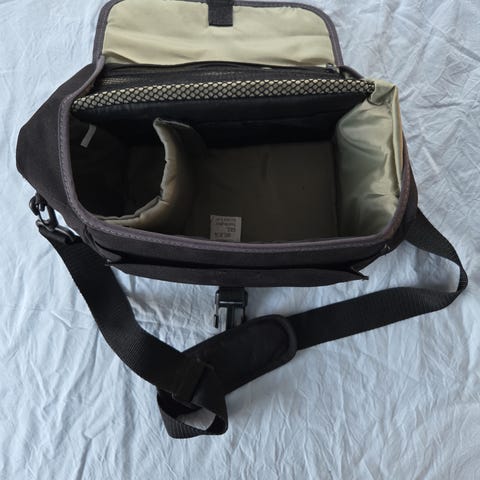 Kameraveske i skulderveskeutførelse i svart farge. Vesken har polstret hovedrom med glidelåslukking og innvendig nettinglomme for småtilbehør. Den er formet for å passe et kamera med objektiv, og har justerbar skulderrem for bæring. Egnet til oppbevaring og transport av kamera og fotoutstyr.