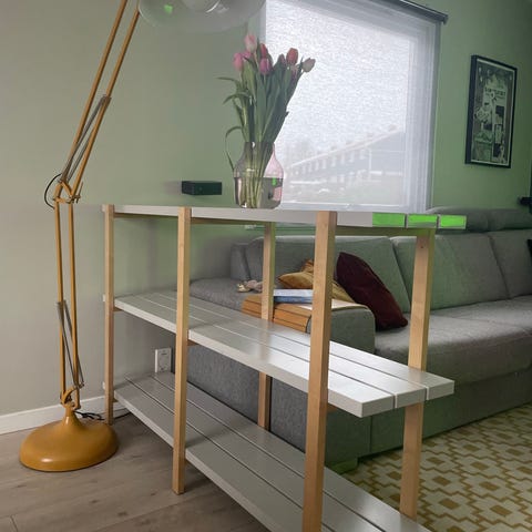 Hylle fra Hay - robust og god i metall, men etter noen år på showroom og i butikk har den fått det vi kaller «patina». Bør uansett fortsatt kunne gjøre en god jobb som lagerhylle eller annet. Vil bli pen igjen med et malingsstrøk.