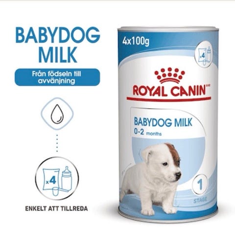 Morsmelkerstatning: Royal Canin Puppy Protech melkepulver til valp. Neonatalmelk med colostrum til valper, egnet som tillegg eller erstatning for morsmelk. Produktet leveres i bøtte og inkluderer tåteflaske med flere smokker og tilbehør til mating av valper. Pulveret blandes ut i vann etter anvisning på emballasjen og brukes til håndmating av nyfødte eller svake valper, eller som støttefôr i overgangsperioden fra melk til fast føde.