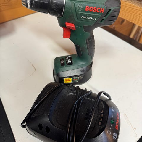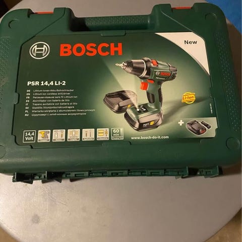Bosch PSR 14,4 LI-2 batteridrill 14,4V. Drillen har sprukket i håndtaket etter at den falt i gulvet. Leveres i original plastkoffert. Inne i kofferten ligger to stk batterier, lader og drillen.