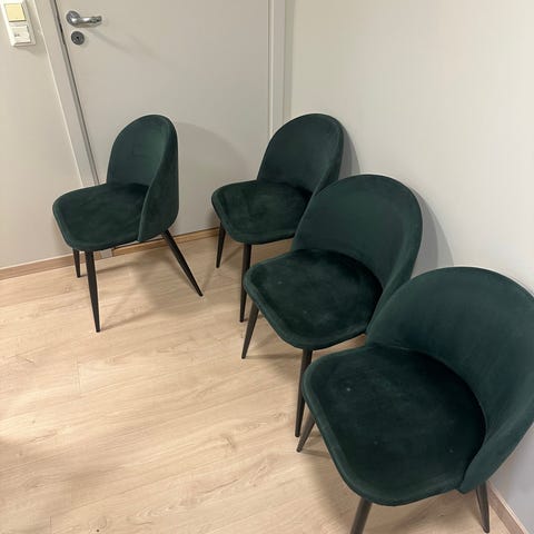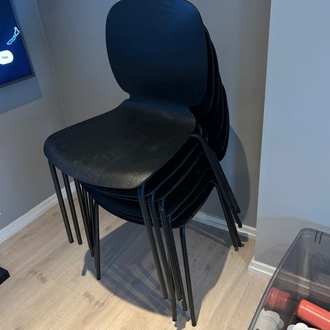 Den ene stolen mangler maling foran så treverket under synes, de andre er stort sett fine og pent brukt/små lite synlige bruksmerker. Nypris var over 2000,- per stol. Kan stables. Selges da de tok større plass her hjemme enn jeg så for meg.