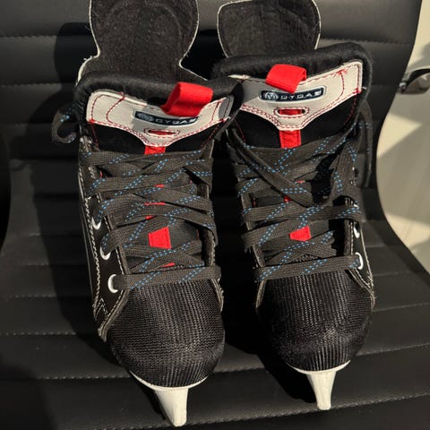 Canada ishockeyskøyter for barn i størrelse 31. Modellen har overdel i tekstil og syntetisk materiale i grå og svart med røde detaljer. Skøytene har lisser for stramming og stålklinge tilpasset ishockeybruk. Egnet for barn som skal bruke skøytene til lek eller trening på is.