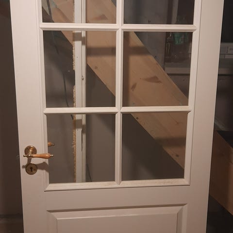 Innerdør med glassfelt i svart ramme. Døren har flere sprosseinndelte glassruter og er tilpasset innvendig bruk. Egnet som romdeler eller dør mellom oppholdsrom der man ønsker lysgjennomgang samtidig som rommene avgrenses.