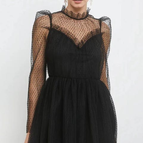 Elisabeth Dress fra Camilla Pihl er drømmekjolen som kombinerer tidløs eleganse med moderne trender. Kjolen er et kunstverk av detaljer Kjolen er svart og laget i polyester. Modellen har gjennomsiktige ermer og overdel med prikket mesh, samt en innsvinget midje og utsvingt skjørt i flere lag.
