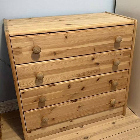Heltre furu kommode, malt i rød. Kommoden har tre skuffer med enkle, integrerte håndtak i front. Passer til oppbevaring av klær, tekstiler eller andre gjenstander på soverom, stue eller gang.