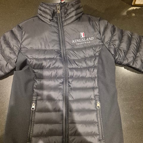 CRW ridejakke i vattert modell i blå farge, størrelse M. Jakken har glidelås i front, ståkrage og sidelommer med glidelås. Brodert rideskole-logo foran og bak. Egnet som ytterjakke til ridning og stallbruk i kjøligere vær.