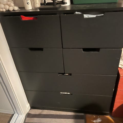 Selger min svarte kommode fra IKEA. Den har noe slitasje (se bildet) i tillegg til noen få riper på toppen. Selges derfor rimelig. Må hentes 27. februar grunnet flytting.
