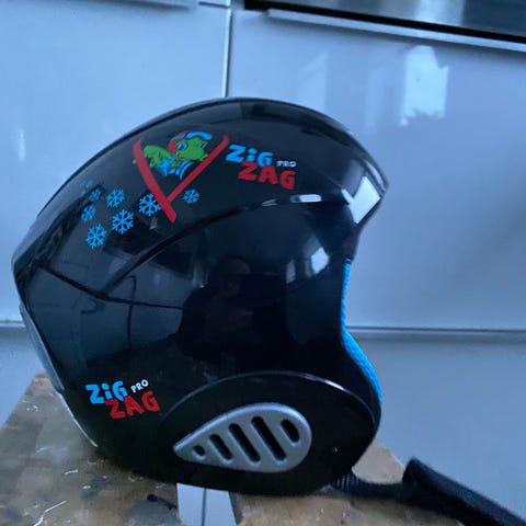 Pent brukt hjelm. Fargen gjør barnet godt synlig i bakken. Brukt en sesong.