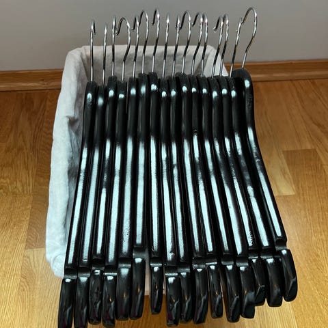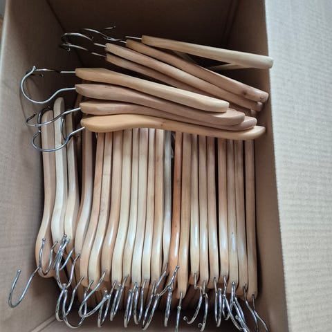 12 stk kleshengere i tre. Meget brukt, og er i god stand. Selges samlet kr. 125,- Kurv følger ikke med. Sendes 📮 Kan også hentes i Horten.
