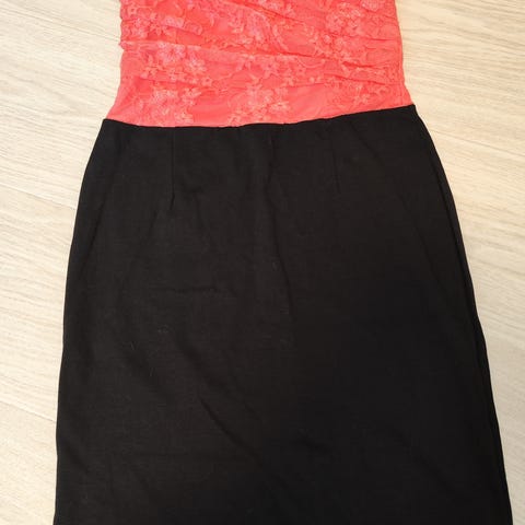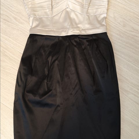 Aldri brukt fordi den er for liten for meg. Silikon/gummikant øverst så kjolen ikke sklir ned. Glidelås i ryggen. Champagnefarget stoff. Draperinger i front.