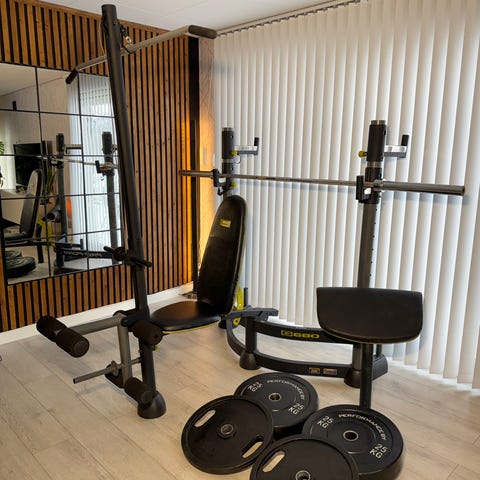 Selger et komplett hjemmegym sett i god og fullt funksjonell stand. Perfekt for styrketrening hjemme – tar lite plass og gir mange treningsmuligheter.