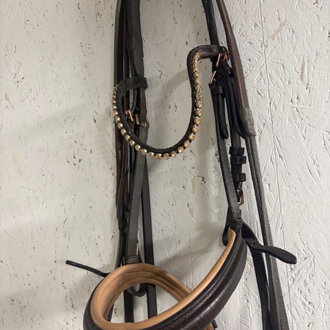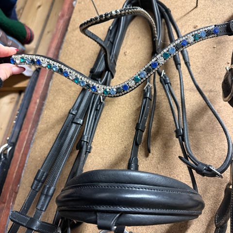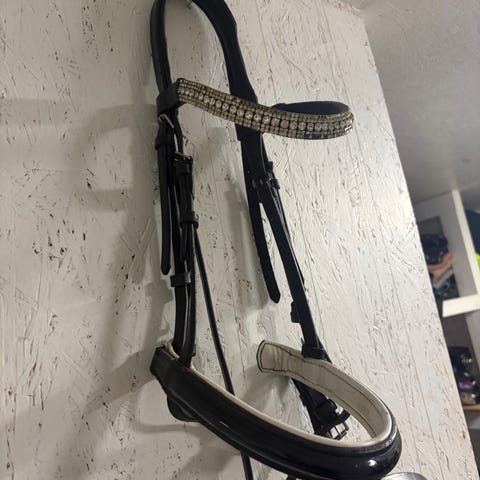 Hodelag til hest i svart lær. Modellen har anatomisk utformet nakkestykke og bredt, polstret nesereim. Pannereimen er buet og dekorert med steiner.