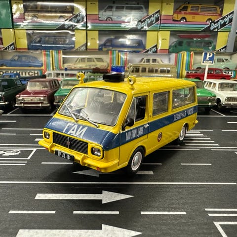 Volkswagen Transporter T1 modellbil i grønn farge. Modellen forestiller en politibil med «Polizei»-merking på siden og blålystopp på taket. Karosseriet har flere dører som kan åpnes, og interiøret er detaljert med seter og dashbord. Passer som samlerobjekt eller utstillingsmodell i en bilsamling eller lekegarasje.
