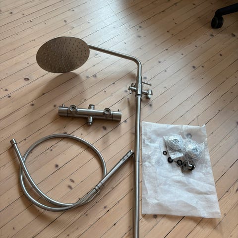 Damixa Akita dusjsett i krom. Settet inkluderer rund takdusj, hånddusj, dusjstang og tilhørende monteringsdeler slik som vist på bildene. Leveres i original emballasje med monteringsanvisning.
