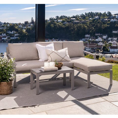 Inneholder to hjørnemoduler, to flate moduler, puter og et bord med herdet glassplate. Produsert i håndflettet kunstrotting med pulverlakkert stålramme.