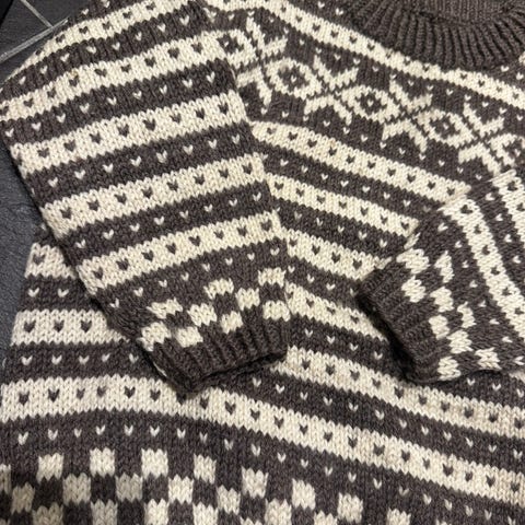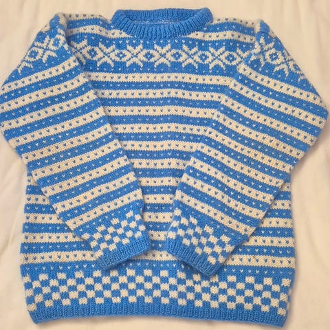 Mål genser - lengde 28 cm, bredde 30 cm, ermer 22 cm. Lue omkrets 35 cm.
