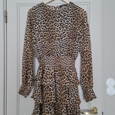 Bik Bok festkjole kjole for dame i størrelse S. Kjolen er beige med mønster og har lange ermer. Den har dyp V-utringning foran. Ruching i stoffet foran og bak gir en drapert effekt. Passer som festkjole eller til andre anledninger der man ønsker en mønstret kjole med tettsittende fasong.