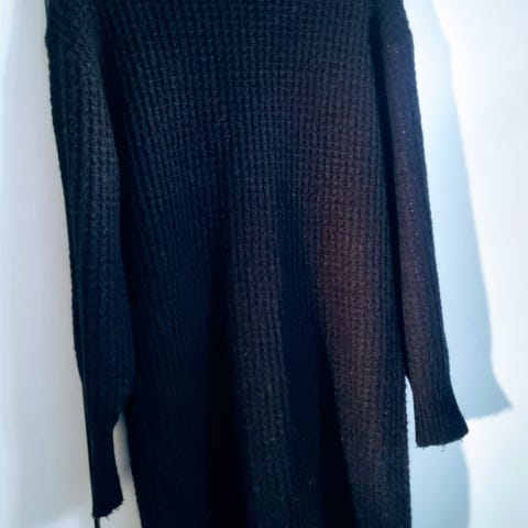 Pen strikket kjole med volanger på skuldrene. Lengde 100 cm. Lyset gjør at den ser falmet/grå ut på bildene, men den er helt sort og lite brukt.