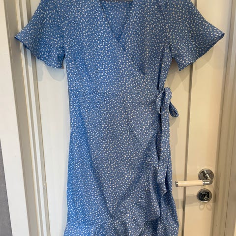 Mango sommerkjole for dame i størrelse S. Kjolen er blå med blomstermønster. Modellen har omslagssnitt med V-hals og volangdetaljer langs utringning og skjørt. Kort lengde, uten ermer, og egnet som lett sommerplagg til hverdagsbruk eller enkle anledninger.
