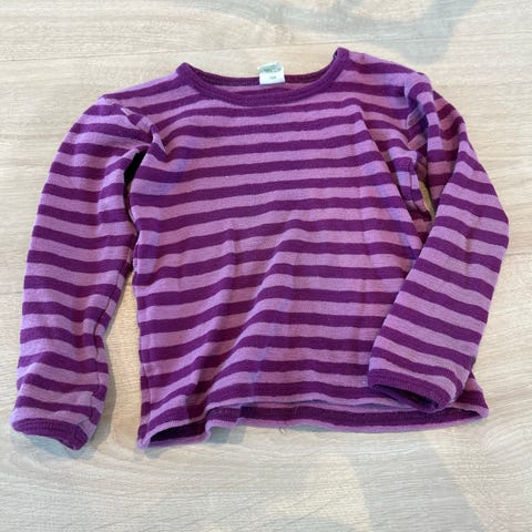 KappAhl Bodyzone ullgenser for jente i størrelse 98/104.. Genseren har lange ermer og rosa og lilla striper. Materialet er en ullblanding med ull, bomull og polyamid, som gir et mykt og behagelig plagg til hverdagsbruk eller som innerlag på kjølige dager.