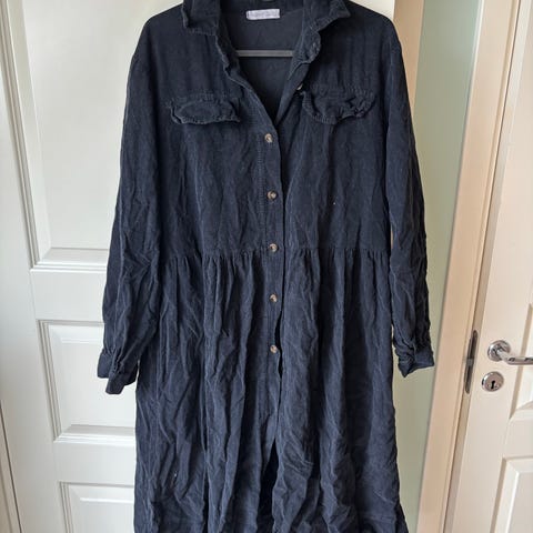 Glidelås i siden. Ermene når sånn ca til håndleddene. Kan brukes både til hverdag og fest. Størrelse 38, og når til litt over knærne (jeg er 170 cm høy).