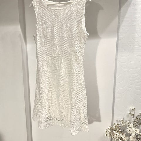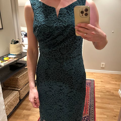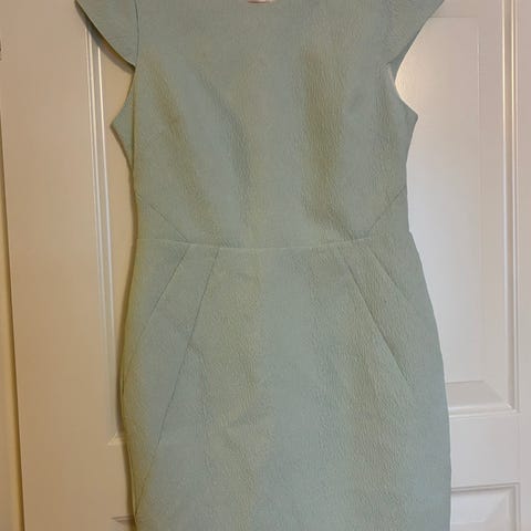 Kjolen er pent brukt. Størrelsen er XL. Brystmål fra armhule til armhule er 49 cm, og hel lengde er 99 cm. 90% polyester og 10% nylon.