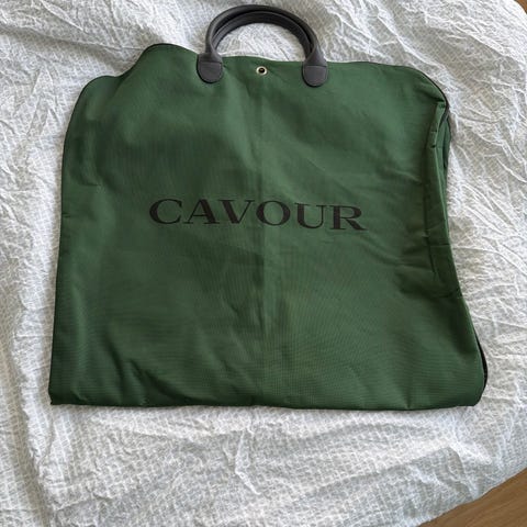 Selger en fin dresspose fra Cavour i kraftig grønt stoff. Håndtak i sort skinn og knapper som kan festes sammen og hull til kleshenger så den er enkel å transportere. Det er også en praktisk lomme hvor man kan legge kontaktdetaljer.