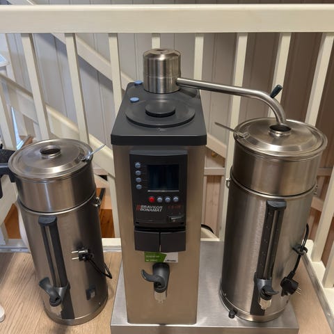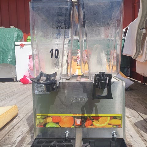 Ugolini Deluxe drikkekjøler med to gjennomsiktige beholdere og rustfritt stålkabinett. Enheten er beregnet for kjøling og dispensasjon av kalde drikker som juice, saft eller iste. Hver beholder har egen tappemekanisme i front og omrører innvendig for jevn temperatur og innhold. Frontpanel og lokk har røde detaljer, og maskinen står på dryppbrett for oppsamling av søl. Egner seg til bruk i kiosk, kafé, kantine eller andre serveringssteder hvor det er behov for servering av avkjølte drikker fra selvbetjent dispenser.
