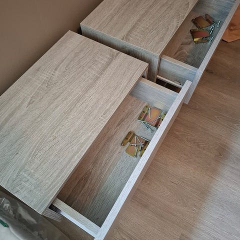 2 stk Hokksund nattbord fra jysk. 500 for begge, 300 for ett av de. Noe slitt i overflaten på toppen, har godt av et strøk med møbelolje.