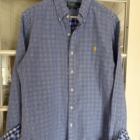 Ralph Lauren skjorte for herre i størrelse M. Custom fit Skjorten er i blått rutemønster og laget av bomull. Den har lange ermer, knappestolpe foran og klassisk krage med knapper. Passer til både hverdagsbruk og mer formelle anledninger der en pen skjorte i bomull er ønsket.