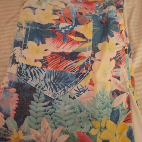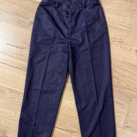 Kjempegøy vintage bukse i lilla/svart med spekket flerfarget mønster. Står str. 33. Jeg bruker vanligvis M,38 og kan bruke den med belte, så kanskje en stor M. Lengde 110cm. Blanding av akryl, poly og ull. Se bilder. Laget i Italia.