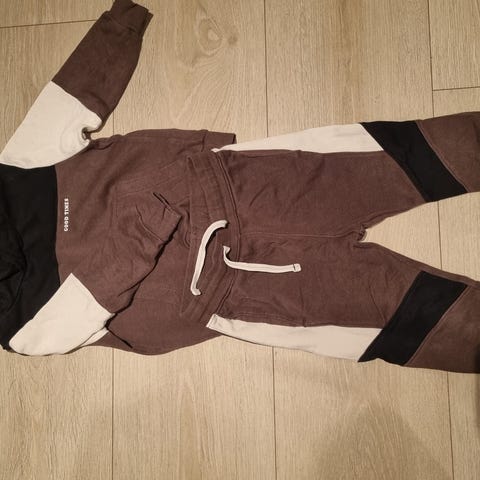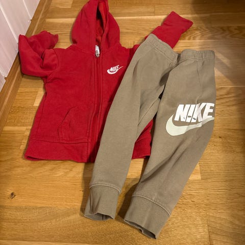 Nike joggedress for gutt i størrelse 98 (ca. 92–98 cm). Sett med hettejakke og bukse i grønn og grå bomull. Jakken har hette, glidelås foran og Nike-trykk på ryggen. Buksen har strikk i livet og Nike-logo på benet. Egnet som hverdags- og fritidstøy for barn i aktuell størrelse.