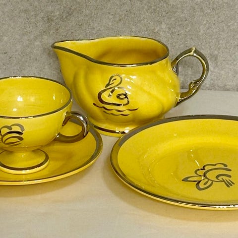Tekanne, fløtemugge, sukkerskål. Stått til pynt, aldri brukt.