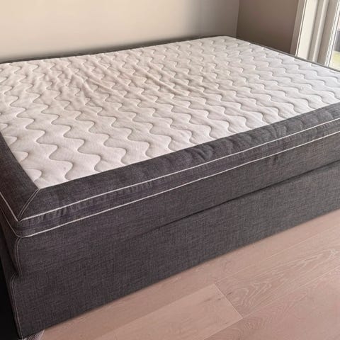 Medfølger vendbar sengegavl og hygienisk overmadrassbeskytter.